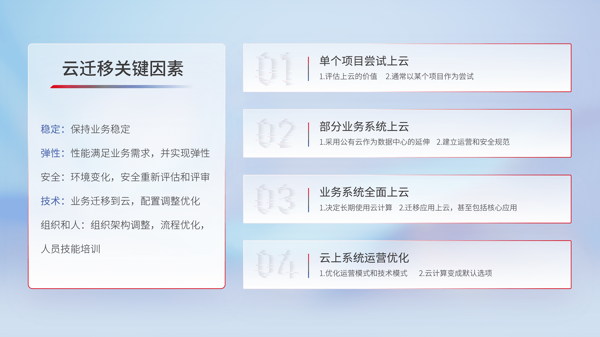 结合实际业务,,从规划设计、、云平台选型、、、云原生改造、、、、数据迁移、、集成交付,,,迁移全过程为客户识别最佳上云路径,,,做好风险识别管理,,,,设计网络架构、、身份权限、、、、安全审计合规、、、操作审计、、日志审计、、监控告警策略、、多站点容灾设计等,,,,对云上基础设施进行整体规划,,提升IT治理水平,,,,以满足弹性、、高可用、、、、高性能的需求。。。