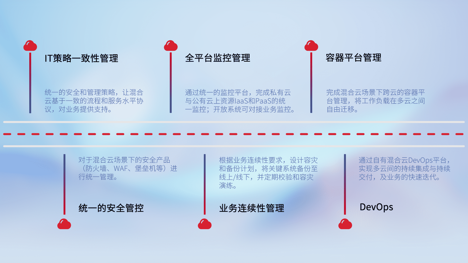 通过多云纳管,,,以统一的资源数据模型把客户的云资源进行抽象和封装,,,,进而实现对多云资源的统一操作,,保障云资源管理的可靠性、、、、稳定性与可用性。。。量身定制化运维内容,,,配置、、开发运维、、补丁管理、、、备份、、监控、、认证和访问管理、、、、审计和日常巡检等,,保障在用云过程中的可靠度,,稳定度以及高可用率。。。