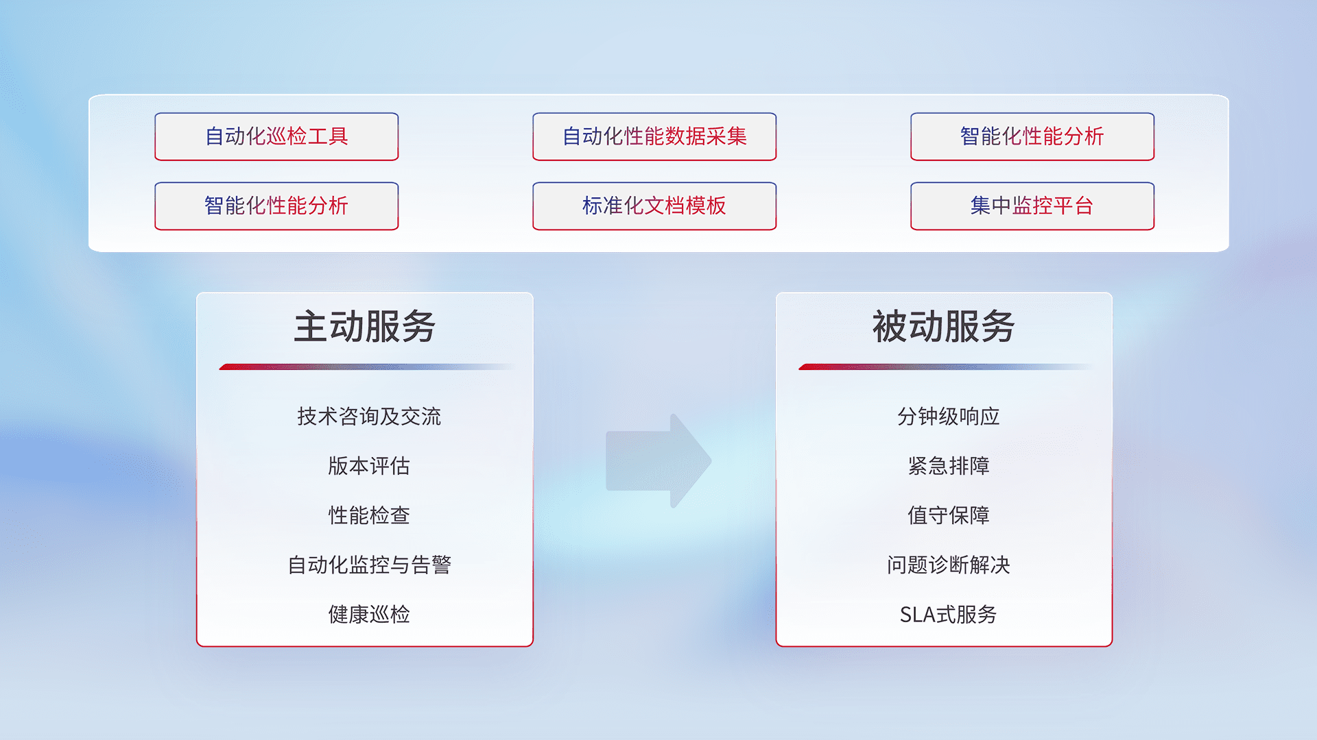 智能化工具和标准化文档,,,保障服务质量,,,,提供主动服务(包含技术咨询、、版本评估、、、、性能检查、、、、自动化监控与告警、、、健康巡检)和被动服务包含(分钟级响应、、、紧急排障、、值守保障、、问题诊断解决、、、SLA服务)。。。。